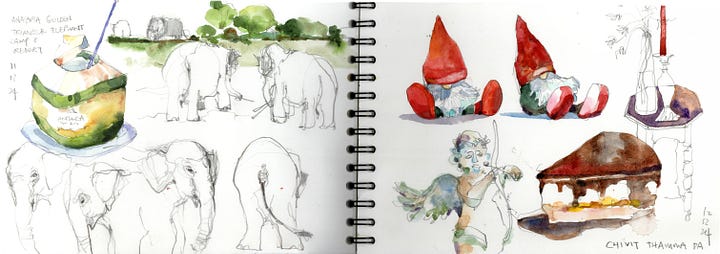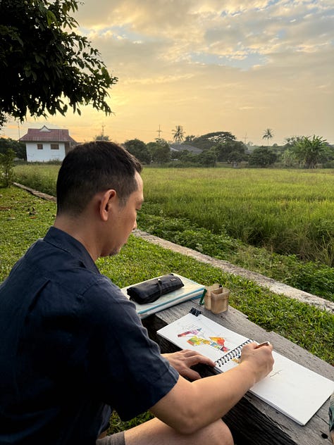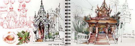 FILL MY CUP - All the sketches you see in this blog post are all made during my recent art excursion to Chiang Rai Thailand (5-12Dec). This excursion was organised by a local artist, Chan Kerk from MyArtSpace and promised to showcase the beauty of Northern Thailand. I signed up for this excursion primarily to be a participant so that I can sketch, play, feast and satiate my curiosity. I think it is important to carve out time to fill your creative bank and feed our mind/soul. This is especially important when you are teaching, giving to others or just busy creating.