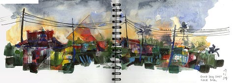 You may not see strict adherence to a single approach or technique to sketch and paint. I just follow my curiosity and go with the flow. I do recommend bringing a few more art tools and materials to support this way of working so that you can try as many techniques and approach without restrictions.