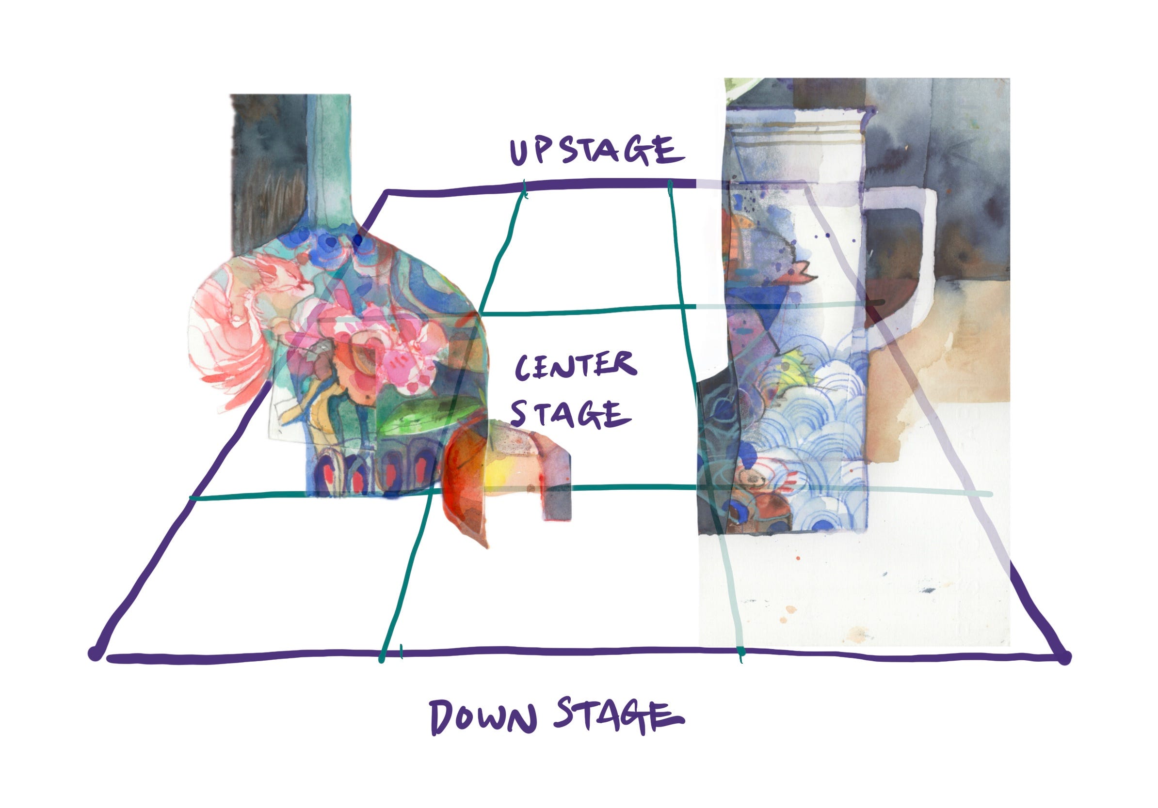 IDEAS FOR YOU TO CONSIDER. Do you want Deep space versus Shallow stage space. How far do you want the viewer to move back in the paper space? Do you want to feel compressed or spacious? How do you want your eyes to wander? Where are the entrance(s) and exit(s)?