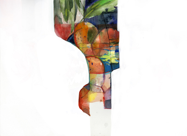 For this artwork, I wanted to compress the center stage zone and allow the downstage section to be open and invitational. Barrier free invitation to enter, meander and examine the mid ground space. The upstage zone is mostly suggestive and creates a illusive backdrop to pull you further back in space. The oranges are the easter eggs for your eyes to find and they also add a contrast of size and scale for interest.