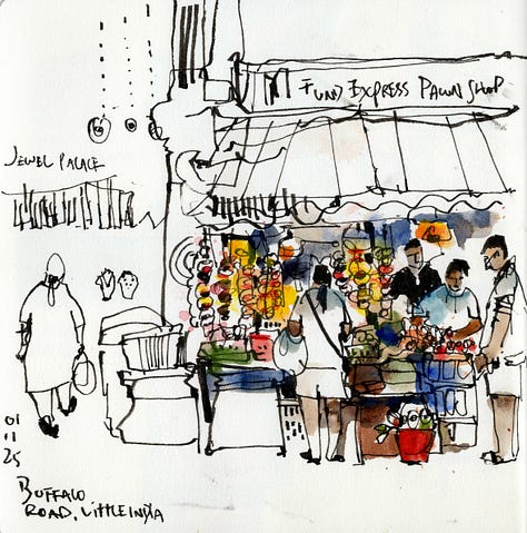 For this post, I sketched and painted a small scene from Tekka Wet Market (Little India) thrice. The scene features a group of ladies (or aunties) busy shopping for spices at the wet market. When I visited the market, I only managed to take pictures as the market was super busy and sketching on-location was just too challenging. Maybe next time I will stand bravely and sketch it live!